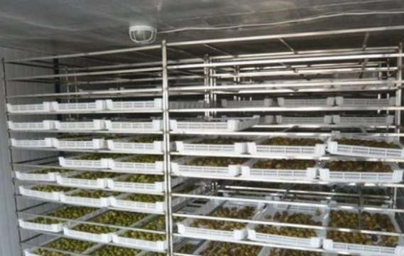 無花果整顆烘干,需要的時間較長一些,先將無花果均勻碼在物料車內(nèi),推入烘干房干燥25-30小時后,再推出烘房外陰涼的地方放置一天,再推入烘房內(nèi)進(jìn)行二次的烘干。無花果烘干機(jī)一天的烘干量視機(jī)型規(guī)格決定,少的以600-800 斤一個批次,多的2000斤一個批次,10000斤甚至更大產(chǎn)能則考慮對吹及組合方式即可。無花果干燥冷卻后還要有一個回軟的過程,注意用塑料薄膜保護(hù)好,以防細(xì)菌滋生。經(jīng)過2天左右的回軟過程即可封袋包裝入庫了。