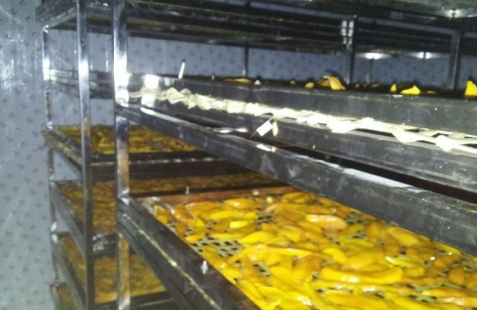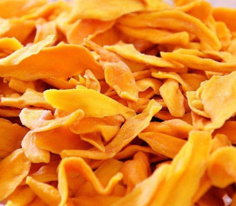 去皮切片:外皮必須去凈,因果皮中含有較多的單寧,如未削凈,在加工過程中容易產(chǎn)生褐變,影響成品色澤。去皮后的果實(shí)用鋒利刀片縱向切片,厚度約為8~10mm。芒果片護(hù)色期間添加白砂糖,一層芒果片一層砂糖,上面還要覆蓋一層砂糖。砂糖腌制時(shí)間不能太長(zhǎng),一般為8小時(shí),過后抽出糖水,把糖水入鍋濃縮,再將果塊倒入糖水中,如果砂糖不夠還可以補(bǔ)加,使糖水濃度達(dá)到45%~60%。注意芒果片不能直接煮制。浸泡糖液初始溫度30左右為宜。浸漬過程的添加成份均要求符合食品衛(wèi)生標(biāo)準(zhǔn)。將芒果片小心取出,瀝干水分后,均勻的擺在烘干托盤上,之后放入烘干房里干燥。一段:時(shí)間4H,溫度45,濕度控制在65%。二段:時(shí)間6H,溫度55,濕度控制在42%。第三段:時(shí)間2H,溫度62,濕度控制在26%。時(shí)間運(yùn)行結(jié)束即可保證芒果干烘干完畢。
