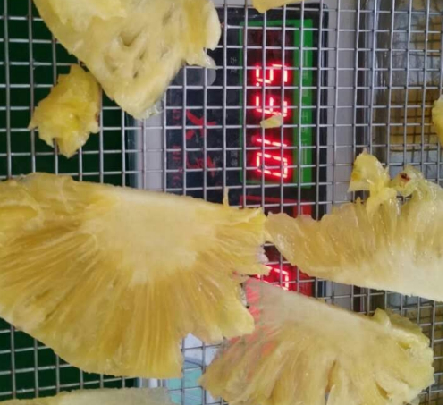 切好的菠蘿片進入熱泵烘干系統里烘干的過程,可以分成5段完成,一段,烘干,不除濕,時間1.5個小時,內外溫度一致,溫度50度,二階段,溫度53度,開始連續除濕,除濕到40%,第三階段溫度58度,連續除濕,濕度26%,第四階段溫度55度,濕度20%,連續除濕,第五段溫度48度,濕度18%,連續除濕1小時,烘干完成。